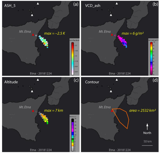 Here we present a new case study (Figure 3) during the 24 December 2018 Etna eruption at 12:15 UTC, in order to show the different HOTVOLC products. Those images are screenshots of the web-GIS interface and have been calculated automatically in real-time. In the first panel, the ASH_5 product allows a clear and unambiguous detection of the ash cloud drifting southeastwardly, right above the Catania international airport, located in the same direction at ~15 km away from the summit craters. The maximum split-window BTD recorded lies around −2.5 K. The vertical column densities (VCD_ash) are provided in the second panel showing a maximum of 6 g/m2 at the end of the plume, and considering an average cloud thickness of 1000 m, one can estimate an ash cloud concentration of ~6 mg/m3, which is well above the threshold value of 4 mg/m3, referenced since 2010 as a “high” level of contamination in the ICAO volcanic ash contingency plan for the EUR/NAT (EURopean and North ATlantic) region. In Figure 3c, the ash cloud top altitude is estimated to be ~7 km a.s.l., which is in fairly good agreement with [42] providing a vertical plume top height in the range 6–8 km at the eruption start from both SEVIRI sensor and ground visible imagery. Similarly, VIIRS satellite data from [43] give a maximum plume top height of 8800 m. In Figure 3d, we show the contour product developed and used by the HOTVOLC system. This is a shape file automatically calculated at each image and producing a contour line around the volcanic ash cloud. This is interesting as it can be compared directly with contours provided on VAG advisories by the Toulouse VAAC.