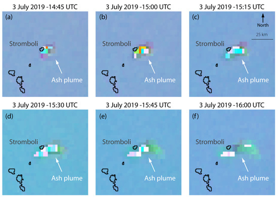 Ash cloud detected by the HOTVOLC system using the ASH-3 product during the 3 July 2019 Stromboli eruption from (a) 14h45 UTC: start of the eruption, (b) 15h00 UTC: maximum concentration, (c) 15h15 UTC, (d) 15h30 UTC, (e) 15h45 UTC, (f) 16h00 UTC.