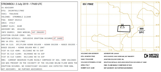 A little later, around 16:00 UTC, the ash cloud was greatly diluted after being transported eastward for barely 2 h. Interestingly, a light green colour on the “Cloud-RGB” product indicates the presence of SO2 in the atmosphere. In Figure 5, we provide the VAA and VAG messages issued by the VAAC of Toulouse during the 3 July 2019 Stromboli eruption. The VAA mentions the eruption start time at 14:48 UTC, which is coherent with the first image detected by HOTVOLC. It also mentions that at 17:00 UTC the plume is mainly composed of SO2 with ash plume present below FL300 (Flight Level 30,000 feet, ~9 km), which is here again very consistent with satellite observations provided by HOTVOLC.