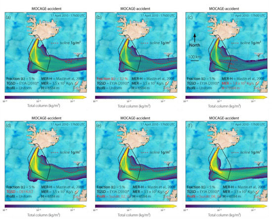 In this section, are presented a series of parametric tests on the Eyjafjallajökull 2010, eruption in order to assess the sensitivity of ash column densities forecasted by MOCAGE-Accident. In addition to meteorological data mentioned above, MOCAGE-Accident needs a set of volcanological input parameters, this includes in particular: the Total Grain Size Distribution (TGSD), the ash column profile (ex. uniform, umbrella, etc.), the top plume height (H) and the source Mass Eruption Rate (MER). Practically, it uses observed plume top height to infer the MER from the empirical relationship given by [48]. Then, a partition coefficient (ε) is applied to the source MER (such as ε × MER) in order to take into account the fine ash fraction only, which alone can be transported to distal location in the atmosphere. A variety of output products can be provided by MOCAGE-Accident. It comprises the concentration at different pressure level, total column densities or concentration charts (i.e., with thresholds identified by a colour code). A sensitivity study has been carried out by varying the input parameters in MOCAGE-Accident. In Figure 6, we provide the total vertical column densities (VCD) at the top-of-atmosphere for 6 cases, so that it can be further compared with VCD provided by HOTVOLC data. Input parameters used are summarized in Table 1 and show different configurations of simulation. In particular, we tested a standard partitioning coefficient of ε = 5% and a modified one of 3.2% (case b). According to [49], the latter is assumed to be the best choice for this eruption. The default VAAC operational TGSD is used (case d) as well as a specific TGSD defined for Eyjafjallajökull 2010, eruption from [6]. The ash column profile above vent is set either uniform or umbrella-shaped (case e, f) using the Suzuki parameters [50]. As described above, the formulation from Mastin et al., 2009 is used in all cases, so there is a trade-off between the plume top height and the source MER. The default altitude [51] for April 17 is defined at 5584 m above vent, and leading to a default MER of 3.5 × 105 kg/s. A 1000-m lower value is tested (case c) leading to a MER of 1.8 × 105 kg/s. Resulting maximum VCD corresponding to above-vent values at the top of the ash column are given in Table 1.