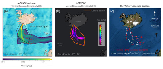 Comparisons of VCD values (in g/m2) between (a) ash dispersion simulations run by MOCAGE-Accident model and (b) satellite retrieval using HOTVOLC products. (c) Superposition of the 1 g/m2 envelope from both methods.