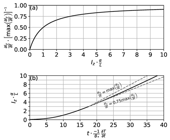 Fog growth in a quasi-steady stable boundary layer. (a) The rate of growth as in Equation (11). (b) The value of in time. The dashed lines indicate the linear growth rate at and the maximum growth rate.