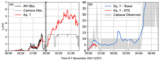 Observed fog height compared with the height estimated by forward integration of Equation (7). (a) High-resolution comparison using distributed temperature sensing (DTS)-estimated saturation (i.e., RH % as the interface (left) and the camera-derived observations of fog depth. (b) Comparison against the fog depth observed along the Cabauw tower. Note, the camera is limited to a depth of 2.25 m, and the tower is restricted to discrete heights such that the observed fog depth is between the maximum height of observed fog, and the level above.