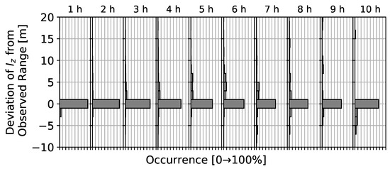 This is, of course, only one event. We did, however, also look at the agreement between observed and estimated fog depths for a further 238 shallow (<40 m) radiation fog events that occurred at the CESAR facility between April 2011 and September 2020 (Figure 6). We compute the deviation of the estimated from the observed range. If the estimated depth falls within the envelope, then the deviation is 0; otherwise, the difference is calculated between the estimated fog depth and the nearest range boundary. While there are some instances of very large differences between the observed and estimated , the majority agree. In particular, falls within the correct range more than 80% of the time within the first 3 h of fog onset, and, except for 5 h and 10 h, is accurate more than 60% of the time.