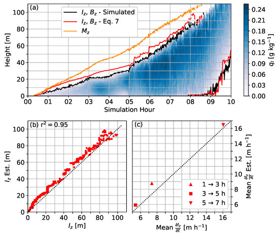 Baseline (BAS) simulation. (a) Liquid water specific humidity with lines indicating the simulated and estimated (according to Equation (20)) , , and . (b) 1:1 comparison of estimated fog depth to simulated fog depth. (c) Comparison of mean estimated growth rate (Equation (7)) with simulated growth rate over two-hour segments.