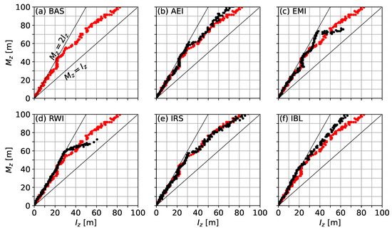 vs. for the simulations, with and for comparison. (a) BAS simulation. (b–f) Labelled simulation (black) on top of BAS simulation (red).