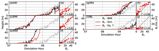 Figure A3 plots the comparison for the additional simulations presented in (Table A2). In the left-hand column, we show simulated , along with the estimated value of using Equation (7), and . For comparison, from the BAS simulation is shown in gray. On the right, the estimated is compared directly with the simulated . Except for the IWI simulation where no fog formed, is very well estimated with Equation (7).