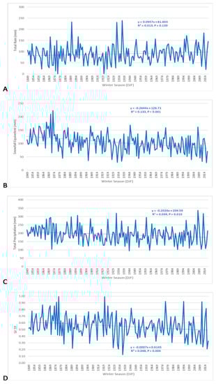 Total precipitation during the winter season in Toronto (Figure 1C) was also decreasing at a statistically significant rate (R2 = 0.039, p = 0.010) of negative 0.20 mm/year. This negative linear trend suggested that winter season total precipitation in Toronto decreased from an average of 209.6 mm to an average of 175.4 mm by the end of the time series. The total precipitation dataset was normally distributed (X2 = 13.066, p = 0.110). Despite a negative serial correlation observed among the data (−0.193), the Durbin–Watson test statistic concluded this autocorrelation to not be statistically significant (d = 2.381, p > 0.05). Nonetheless, we also used Kendall’s Tau rank correlation (T = −0.142, p < 0.05) to validate the linear regression findings and confirm the negative trend associated with the total precipitation time series, indicating winters became drier in Toronto due mainly to less snowfall.