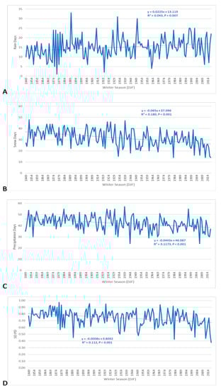 The total number of precipitation days during each winter season in Toronto (Figure 2C) was also decreasing from 1849 to 2017 at a statistically significant rate (R2 = 0.117, p < 0.001) of negative 0.04 days/year. The equation for the slope of this linear trend line suggested that the average number of precipitation days each winter season in Toronto decreased from 46.1 days to 38.6 days, over the course of this time period. The annual sum of winter season precipitation days in Toronto from 1849 to 2017 was normally distributed (X2 = 10.090, p = 0.433). A weak negative serial correlation was observed among the data (−0.015), but the Durbin–Watson test statistic concluded this autocorrelation not to be statistically significant (d = 2.009, p > 0.05). Nonetheless, we also used Kendall’s Tau rank correlation (T = −0.280, p < 0.05) to validate the negative slope of the linear trend line associated with the decreasing number of winter season precipitation days over time, indicating that winters in Toronto were experiencing fewer days with precipitation events over this time period.