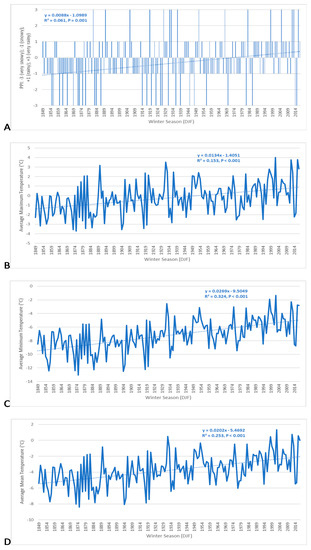 Mean temperatures during the winter season (Figure 3D) were increasing at a statistically significant rate (R2 = 0.253, p < 0.001) of 0.02°C/year from 1849 to 2017. The positive slope of this linear trend line suggested that the mean temperatures during the winter season increased from an average of −5.47°C to −2.06°C by the end of the time series. Mean temperatures during the winter season were normally distributed (X2 = 5.206, p = 0.391). Although a weak negative serial correlation was observed among the data (−0.042), the Durbin–Watson test statistic concluded that this autocorrelation was not statistically significant (d = 2.074, p > 0.05). Nonetheless, we used Kendall’s Tau rank correlation (T = 0.342, p < 0.05) to validate the positive slope of the linear trend line associated with warming winter season mean temperatures.