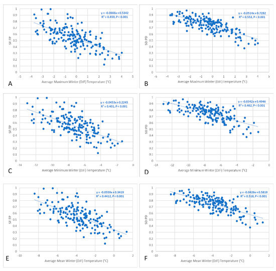 Correlations between winter temperatures (Tmax, Tmin, Tmean) with the snowfall to total precipitation (SF:TP) ratio (A–C) and with the snow days to precipitation days (SD:PD) ratio (D–F) in Toronto (1849–2017).