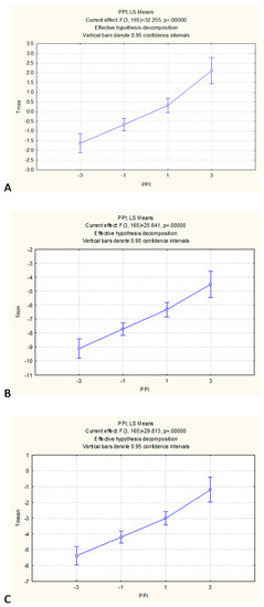The final precipitation phase metric we explored to quantify the changing nature of the precipitation phase in Toronto was the precipitation phase index (PPI). Because the PPI variable is categorical, we presented the correlations with temperature using a series of one–way ANOVA effects graphs (Figure 5A–C). However, we still ran the analysis for both linear regression and Kendall’s Tau rank correlation and have reported those results in conjunction with the one–way ANOVAs illustrated below.