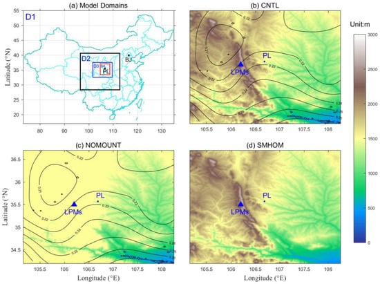 (a) Map of model domains and (b–d) terrain (shaded, units: m) and soil moisture (black contours, units: m3 m−3) in the (b) control (CNTL), (c) terrain removal (NOMOUNT), and (d) homogeneous soil moisture (SMHOM) experiment. PL refers to Pingliang Station and Liupan Mountains is indicated as LPMs.