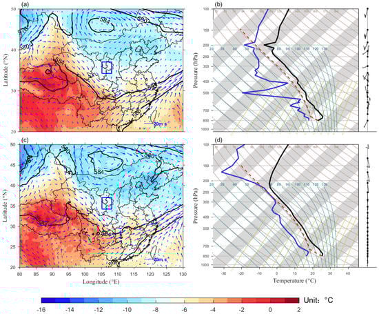 (a) Composite map of geopotential height (black contours, units: gpm), temperature (shaded, units: °C), and wind vectors (blue vectors, units: m s−1) at 0700 LST at 500 hPa from ERA-interim and (b) observed radiosonde soundings at 0700 LST at Pingliang on 29 June 2017, black and blue solid lines denote temperature (units: °C) and dew-point temperature (units: °C), respectively, and red dotted line represents the air mass curve. The long and short bars on the right-hand denote 10 m s−1 and 5 m s−1, respectively, (c) same as (a) but from the WRF simulation, (d) same as (b) but from the WRF simulation.