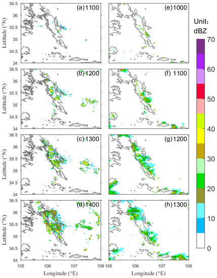 Observed (a–d) and simulated (e–h) radar composite reflectivity (shaded, units: dBZ), (a) 1100, (b) 1200, (c) 1300, (d) 1400; (e) 1000, (f) 1100, (g) 1200, and (h) 1300 LST. The solid black lines are the 2000 m terrain contours.