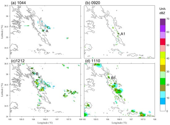 The triggered convection did not necessarily develop into deep convection, we therefore focused on the initiations of deep convection. Two initiations were identified in observations marked as A (Figure 4a) and B (Figure 4c). A is the first initiation point that occurred at 1044 LST in the middle of the mountain; while B was initiated at 1212 LST in the north of the mountain. As for WRF, the first convection was triggered at point A1 at 0920 LST in the middle of the mountain and at point B1 at 1110 LST in the north of the mountain (Figure 4b,d). Generally, the locations of the observed and the simulated convection initiation were quite similar, but the timing of convection initiations are different. The simulated convections tend to be triggered earlier than observations.