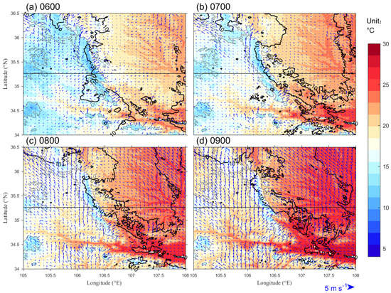 Simulated temperature (shaded, units: °C) and specific humidity (black thick line, units: g kg−1) at 2 m overlapped with 10 m wind field (blue vector, units: m s−1), (a) 0600, (b) 0700, (c) 0800, and (d) 0900 LST. The gray thin lines are the 2000 m terrain contours, the black solid line is the location of the cross-section shown in Figure 6.