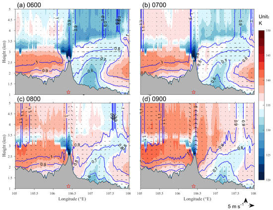 Cross-section of simulated pseudo-equivalent temperature (shaded, units: K) and specific humidity (blue solid lines, units: g kg−1) and wind field (black vectors, units: m s−1) along 35.26° N. (a) 0600, (b) 0700, (c) 0800, and (d) 0900 LST. The gray-shaded area is the terrain, and the red pentagram indicates the location of A1.