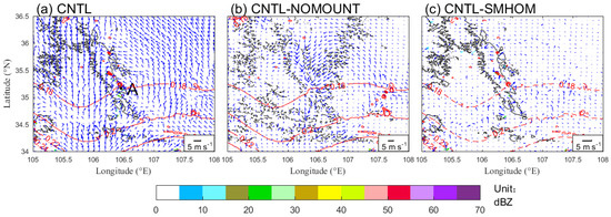 Simulated radar composite reflectivity (shaded, units: dBZ), wind field (blue vector, units: m s−1), and 7 cm-soil moisture (red solid lines in (a) and (b), and red dashed lines in (c), units: m3 m−3) at 0920 LST. (a) CNTL, (b) NOMOUNT, and (c) SMHOM. The wind shown in (a) is the 10 m wind from CNTL, in (b,c) are the differences of 10 m wind field between CNTL and the corresponding sensitivity tests. The solid black lines are 2000 m topographic contours, the dash black lines in (b) are 1500 and 2000 m topographic contours of CNTL.