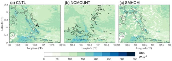 Sensible heat flux (SH, shaded, units: W m−2) difference between 0500 and 0800, (a) CNTL, (b) NOMOUNT, and (c) SMHOM. The solid black lines in (a), and (c) are 2000 m topographic contours, the black dash line in (b) outline the region with removed terrain (1500 m topographic contour).