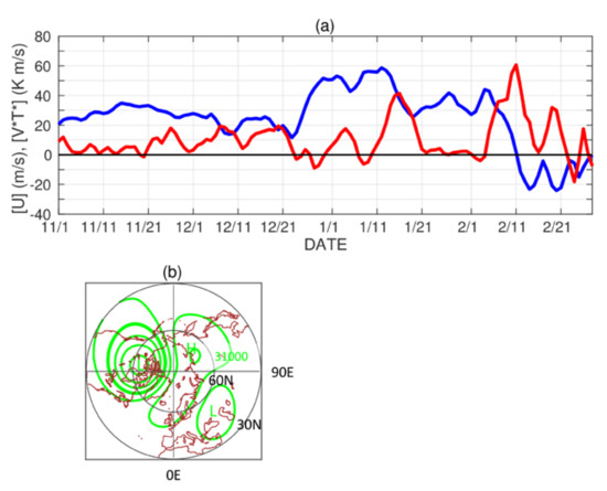 (a) Time series of the zonal mean zonal wind [U] at 60° N, 10 hPa (blue), and waves 1–3 poleward heat flux [V*T*] in 40–90° N, 100 hPa (red) in the JRA-55 data. Panel (b) plots the 10 hPa geopotential height in the JRA-55 data averaged for 5 days (±2 days) around the major sudden stratospheric warming (MSSW) onset date of 12 February. Thick contour is for 30,000 m, and the contour interval is 500 m.