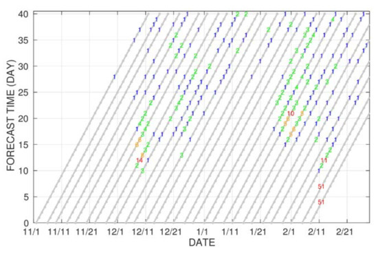 For a forecast dataset, this study targets ECMWF real-time forecasts available in the S2S prediction database [9]. The forecasts analyzed are those initialized in the 2017/2018 Northern Hemisphere winter season, from November to February. We chose the ECMWF system for this study, because it provides relatively abundant data in terms of initialization frequency and ensemble size [9]. The system was also shown to be one of the best systems in the S2S project database in forecasting MSSWs [13,14,15,16]. The initialization frequency is every 3 or 4 days. The ensemble size is 51 for each initialization.