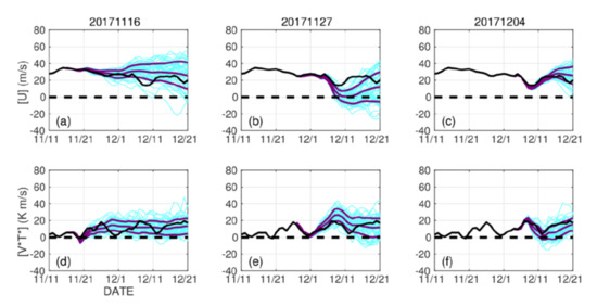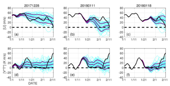 As in Figure 1, but for the target MSSW and comparison non-MSSW ensembles for the first cluster (Table 1). The initialization dates are indicated above the panels. Top panels (a–c) plot the zonal mean zonal wind, and bottom panels (d–f) plot the heat flux. Cyan lines are for all ensemble members. Purple lines plot the ensemble mean ± one standard deviation. Black line is for the JRA-55 data.