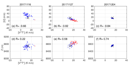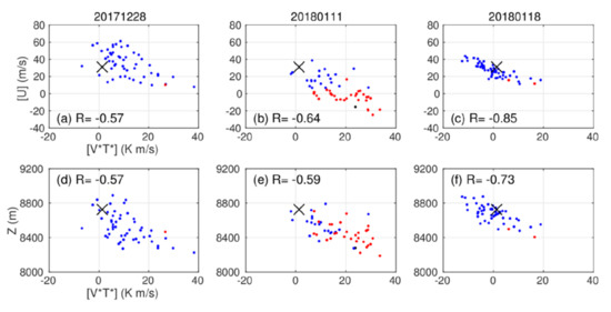 (a–c) Scatter plots between the waves 1–3 heat flux over 40–90° N, 100 hPa, and the zonal mean zonal wind at 60° N, 10 hPa for all members in the MSSW (b) and non-MSSW (a,c) ensembles for the first cluster. The zonal mean zonal wind is averaged for 5 days around RD. The heat flux is averaged from RD-6 to RD. The forecast data are plotted by dots in different colors, with a black cross for the JRA-55 data. Red dots are for MSSW members, blue dots for non-MSSW members, and black dots for the rest (the rest includes no member for these initial dates). The initial dates are denoted above the panels. The number in each panel denotes the correlation coefficient for all ensemble members. Panels (d–f) are similar, but use the 300 hPa geopotential height averaged over a region of 65 ± 10° N, 305 ± 15° E from RD-6 to RD, instead of the zonal wind.