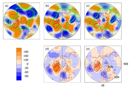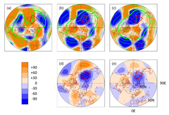Figure 12b,c compare 300 hPa height fields between the MSSW and non-MSSW member means. The comparison shows lower values, indicating a more pronounced upper-air low or trough, over northeastern Eurasia around 65° N, 150° E (Figure 12d). This location corresponds to where the climatological wave field has a trough (Figure 7). This signal is again reminiscent of the observational result [28,29].