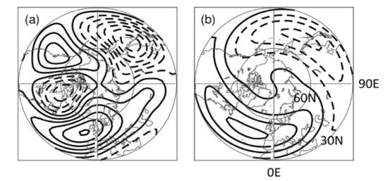 The positive height values over northeastern Canada and Greenland in Figure 6d,e are in phase with the ridge of the climatological wave 1 (Figure 7), and hence are likely to lead to increased wave 1 amplitude and activity through constructive interference. They are also reminiscent of a precursory tropospheric height signal for MSSWs obtained for a reanalysis data set [28,29].