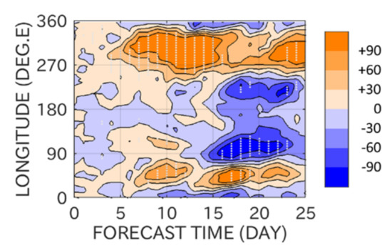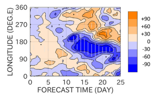 Forecast time–longitude section of the composite difference of the MSSW members from the non-MSSW members in the MSSW ensemble for the first cluster. The difference is averaged in latitude over 65 ± 10° N. Dots indicate where the difference is significant at the 95% level. The dots are plotted every two longitudinal grids at most to avoid too dense plots.