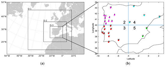 (a) The domain used in the Weather Research and Forecasting (WRF) regional implementation, with 81, 27, and 9 km of horizontal resolution [52] and (b) division of the studied area per regions in the Iberian Peninsula.