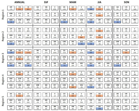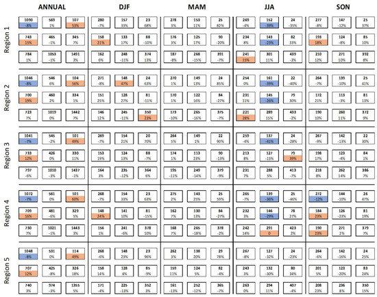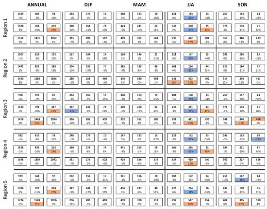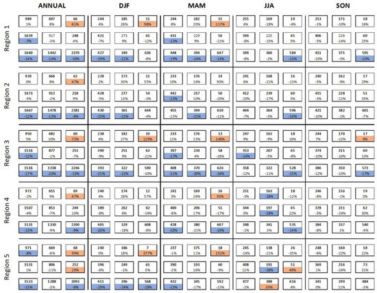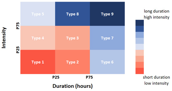 Extreme events were identified and categorized into nine classes/types as a function of their duration and intensity, according to the following method: the duration of an event is the number of hours of the event. Intensity of an event is calculated as the average difference between the variable value minus a threshold of that variable (i.e., 90th percentile computed over the full series for the historical period) for the event. Next, for each city, the 25th and 90th percentiles of intensity were determined and, together with the duration threshold of 6 h and 36 h, were used as the criterion to allocate an event to a category. Hence, all of the events for each variable are allocated to an event type from 1 to 9. Figure 2 shows the matrix of the types of events considered. Furthermore, the percentiles and the corresponding event classification were first calculated for each city, separately. For further analysis, the event classification was also performed by season (winter: December to February, spring: March to May, summer: June to August, autumn: September to November) and aggregated for the whole Iberia (1) and in four sub-regions (2, 3, 4, and 5, Figure 1b), which correspond to the quadrants of the study area. Region 2 represents the north-western quadrant, region 3 is southwest, region 4 northeast, and region 5 southeast. This division is somewhat subjective although it represents crude regions of common synoptic behavior. However, we also show results for individual stations and do not fully rely on the regional division. Additionally, most of the analysis is performed and shown for individual stations. Only in 3.4 (extreme events by type) the regional division is used in order to minimize the amount of results to be shown.