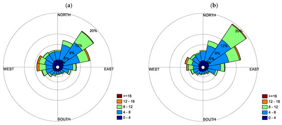 Wind roses for wind at the surface in Lisboa for (a) historical and (b) future climates. Each colour represents an interval of wind speed. Sixteen directional divisions. The circles mark the number of occurrence (in percentage) for each wind direction (16 direction bars were considered).