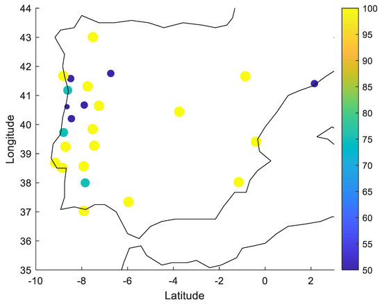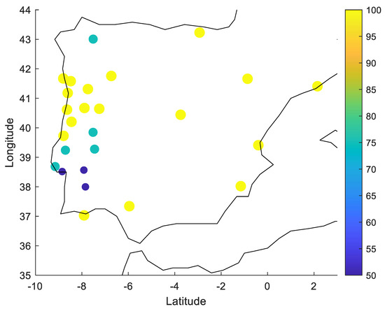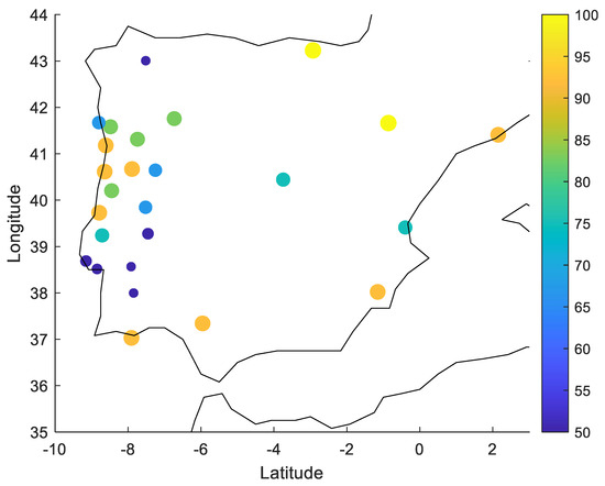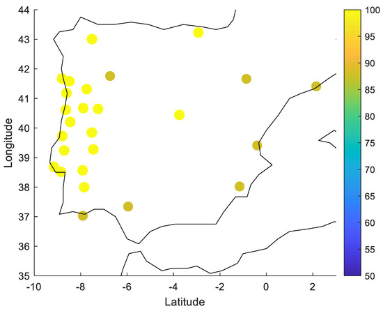 The WRF (Weather Research and Forecasting) model was used in the present study. The simulations were carried out with three nested domains and with a two-way coupling procedure [52]. The domains (Figure 1a) have a horizontal resolution of 81 km (outer/parent domain, D1), 27 km (intermediate domain, D2) and 9 km (inner domain, D3). The initial and boundary conditions for these experiments were retrieved from simulations previously generated by the MPI-ESM-LR global climate model (Max Planck Institute Earth System Model—Low Resolution) and the ERA-Interim reanalysis [53,54]. The data were extracted for domain D3 (horizontal resolution of 9 km), from which the nearest-point approach was applied to obtain data for the 26 cities in the Iberian Peninsula (Table 1). This network is sufficiently dense for a general assessment of the potential changes in the tropospheric wind characteristics over the Iberian Peninsula. In fact, changes in the mid-latitude wind characteristics above the boundary layer (free atmosphere) tend to be largely dominated by planetary and synoptic-scale anomaly patterns.