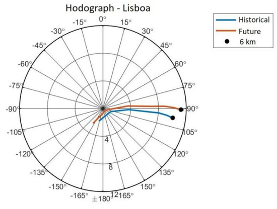 Hodograph for Lisboa, from 0 to 6 km, for historical (blue line) and future (orange line) climates.