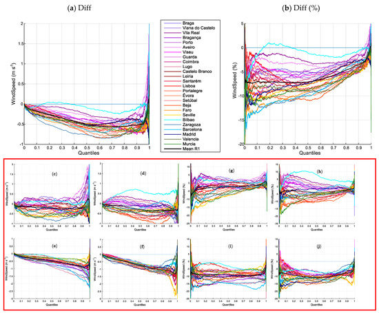 Figure 11 shows 850 hPa-wind speed quantile differences between future and historic climates for all cities, for both annual and seasonal conditions. For the former, the differences are generally negative across the distribution. Regarding the seasonal analysis, winter is the only period depicting nearly zero differences. Largest negative differences are observed for summer and autumn. These represent, for annual conditions, a reduction of wind speed in the future of about 5% or 0.5 m s−1, on average, for all cities with some dispersion across cities. This may represent a reduction of resources for wind energy applications. Extreme right quantiles are about 15 m s−1 for quantile 0.90, 19 m s−1 for quantile 0.95, and 25 m s−1 for quantile 0.99. Maximum values are about 48 m s−1.