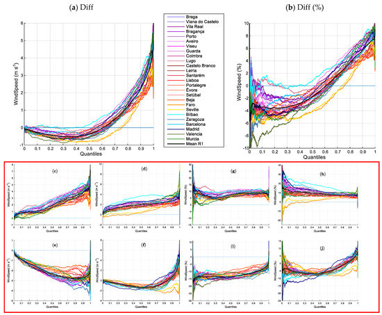Differences (future-historic) for wind speed at 300 hPa for annual and seasonal conditions, as a function of the quantiles of the corresponding empirical distributions. (a) Absolute differences (m s−1) and (b) relative percentual differences (%). Seasonal absolute differences are also represented for (c) winter, (d) spring, (e) summer and (f) autumn, and Seasonal percentual differences for (g) winter, (h) spring, (i) summer and (j) autumn. The black line (Mean R1) refers to the mean of region 1 (total area).