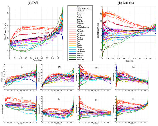 Differences (future-historic) for wind shear 0–6 km for annual and seasonal conditions, as a function of the quantiles of the corresponding empirical distributions. (a) Absolute differences (m s−1) and (b) relative percentual differences (%). Seasonal absolute differences are also represented for (c) winter, (d) spring, (e) summer and (f) autumn, and Seasonal percentual differences for (g) winter, (h) spring, (i) summer and (j) autumn.The black line (Mean R1) refers to the mean of region 1 (total area).