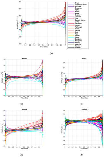 Absolute differences (m2 s2, future-historic) for helicity 0–3 km for annual and seasonal conditions, as a function of the quantiles of the corresponding empirical distributions. The black line (Mean R1) refers to the mean of region 1 (total area). (a) annual, (b) winter, (c) spring, (d) summer, (e) winter.
