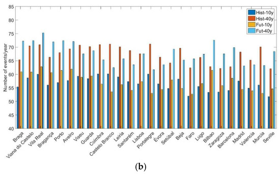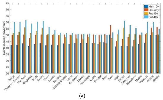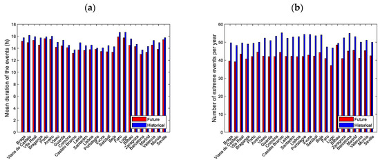 Table 5 shows the intensity of the monthly and annual mean wind at the surface, for each city, for the historical period and the difference between the future and historical periods. In general, the intensity of the average wind decreases for all months, except June, July, and September, when it increases. In regional terms, it can be concluded that, throughout Spain, the average wind speed will decrease, except for Lugo, while in Portugal there is a division between cities to the north and south of Santarém. The cities northwards of Santarém (inclusive) and Faro have lower wind speed at the surface for the future, while cities to the south show average increases in this variable.