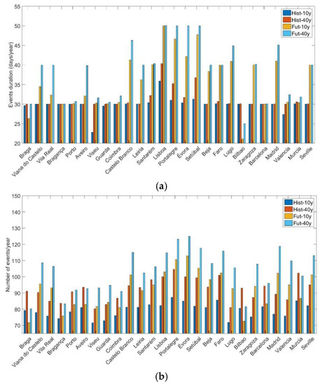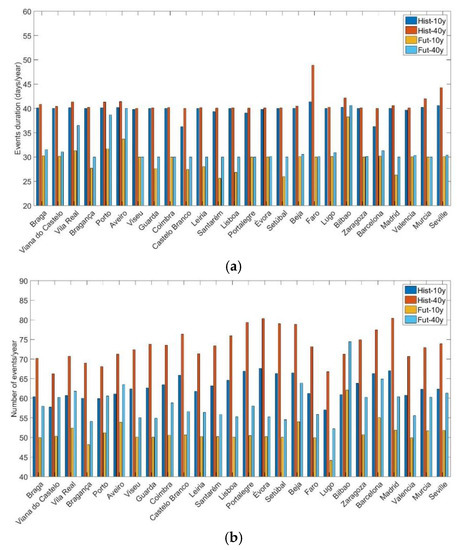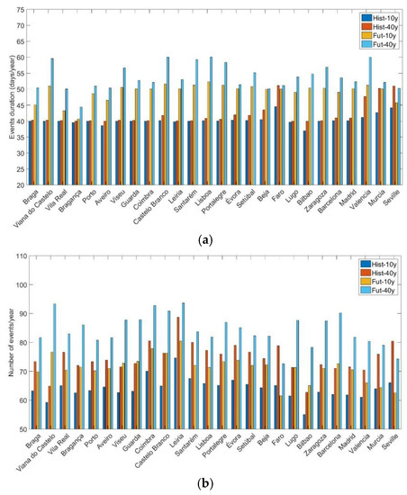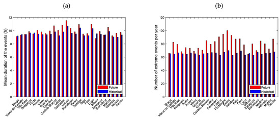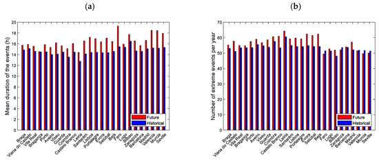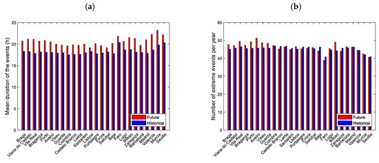 Finally, the return periods of the extreme events were calculated for both the number of events per year, using the Weibull distribution moments method [63], and the duration of events, while using the Gumbel distribution method [64]. Among a large pool of theoretical distribution functions, the latter two were eventually chosen, since they provide the best adjustments to the empirical distributions, according to the Kolmogorov–Smirnov test (not shown). The return periods are estimated for each climate when considering that it is a sample of the same population (stationary climate).