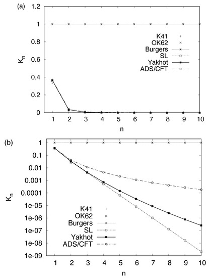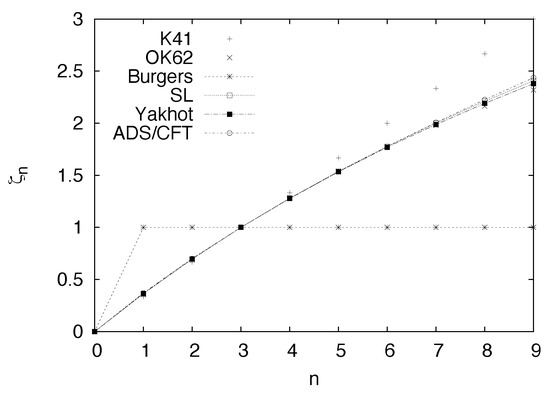 Yakhot [29,30] introduced a model for structure function exponents based on a mean-field approximation. Similar scaling exponents were first derived by Novikov [31] and subsequently by Castaing [32]. With the choice of , structure functions agree equally well with experimental data as the popular She–Leveque model. The translation to the Krames-Moyal coefficients is given by