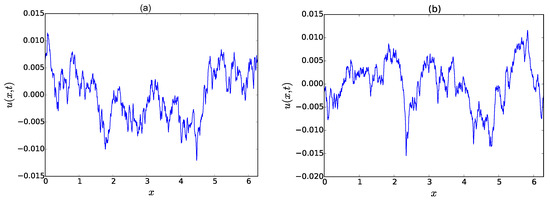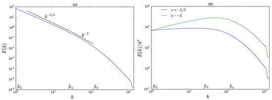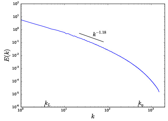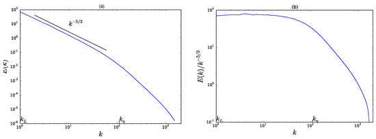 Equation (26) has been solved with the help of a standard pseudo-spectral code. A third order Runge–Kutta method was used for the time stepping due to its vigor of capturing the temporal evolution of shock-like structures [38]. Furthermore, aliasing errors that occur due to an insufficient resolution of the quadratic nonlinearities were treated with the help of a filter in Fourier space [39]. Concerning the realization of the forcing determined by Equation (27), we assured the white-noise in time condition with a numerical method for the Langevin equation discussed by Higham [40]. Cheklov and Yakhot [36] reported that a power law correlation function results in a Kolmogorov-type spectrum which can also be determined on the basis of a one-loop renormalization group consideration. Here, the nonlinearity directly balances forcing contributions that are acting on all scales. Therefore, the cut-off of the forcing is located in the neighborhood of the dissipation range in all simulations.