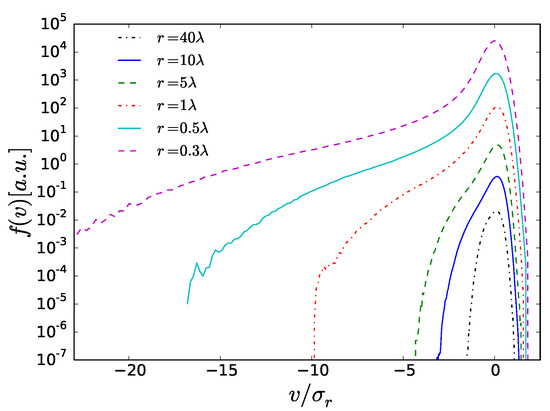 Figure 5 shows the evolution of the one-increment PDF in scale, where r is expressed in multiples of the Taylor length . At small scales, the PDF shows a pronounced left tail due to shock events, whereas it is close to Gaussian on large scales. Here, the PDF for seems to exhibit an algebraic part for negative increments and drops exponentially for larger negative increments. However, it is not obvious whether the algebraic part corresponds to as it has been predicted for the gradient PDF [15]. Due to the moderate Reynolds numbers, it is also not clear whether the exponential decay for large negative velocity increments follows the exponential decay predicted from instanton calculations [41].