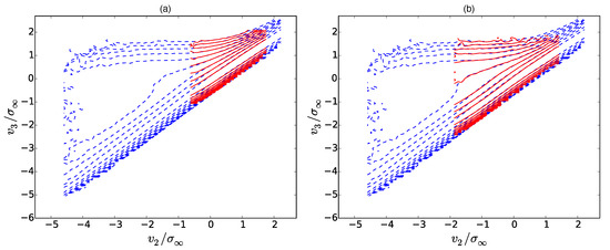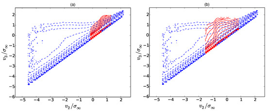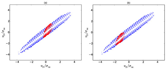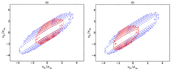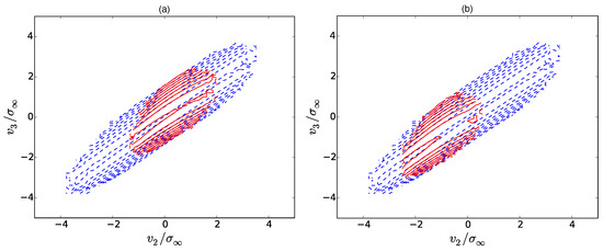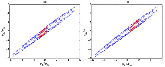 (a) examination of the Markov property (28) from DNS of Burgers turbulence for and via a logarithmic contour plot. The dashed blue contour lines correspond to whereas the red lines correspond to . The Markov property is fulfilled only approximately. Although the contours exhibit an almost identical shape, they seem to be slightly displaced. The shape of the transition PDF (blue) can be reproduced for the most part by the theoretical predictions (31); (b) same as in (a), but for . A broader part of the blue dashed lines that belong to can be covered in comparison to (a). Event though the red contour lines indicate insufficient statistics in the boundary regions, the Markov property has not deteriorated in comparison to (a).