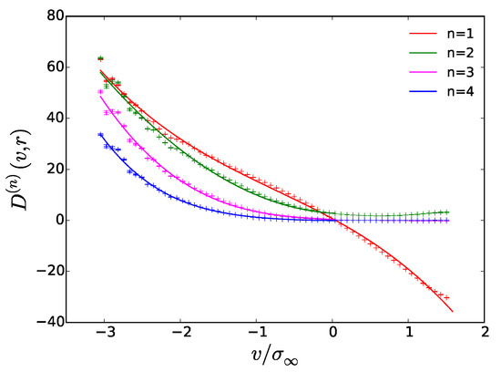 has to be determined from the extrapolation of the conditional moments in order to obtain the corresponding Kramers–Moyal coefficient [10]. As an example, we plotted the conditional moments of first order for three different in Figure 10. drops against zero for as the Markov property is violated. In order to extrapolate the moments, polynomial fits of second order in were performed for (blue lines in the plots). The Kramers–Moyal coefficient for a particular v, in this case the drift coefficient, can be read off from the y-intercepts of the fits. Consequently, this procedure has to be repeated for several v (and in general also different r) for the sake of obtaining the full functional form of the Kramers–Moyal coefficients. The method was used for the Kramers–Moyal coefficients up to order four in Figure 11. The corresponding coefficients were fitted with polynomials of order n. The obtained reduced Kramers–Moyal coefficients correspond well with the theoretical predictions from Equation (22) even at such small Reynolds numbers. Kramers–Moyal coefficients of higher order are detectable for negative velocity increments and Pawula’s theorem [34] is violated. The drift coefficient possesses an additional cubic v-dependence that has already been reported in the experiment [10]. In the Burgers case, only the drift coefficient is different from zero for positive increments, which underlines the self-similarity of the right tail of the PDF in Figure 5. The diffusion coefficient, however, possesses an additional positive intercept which turns out to be a consequence of the non-conservative forcing procedure. In fact, it can be shown that a conservative force in Equation (26) leads to the vanishing of the intercept.