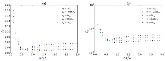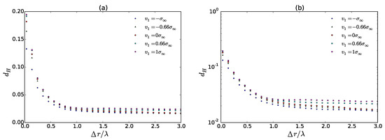 The corresponding dependency in Figure 9a is expressed in terms of the Taylor length . Remarkably, the Hellinger distance is smallest at around and approaches a small constant that is different from zero for larger . This corresponds to the observation from Figure 6 where the contour plots were slightly shifted in the -direction for larger . In other words, the Markov property gets slightly better before it gets worse in the process of letting . The latter observation differs from usual investigations of the Markov property in turbulence [10]. For smaller , however, the Hellinger distance shows a more pronounced increase and therefore, the Markov property is clearly violated since it seems to approach 1 in the limit . These effects become even more unambiguous for . Figure 9b shows a semi-logarithmic plot of the Hellinger distance. For , a quantitatively new behavior emerges. The latter is characterized by a close to exponential increase of the Hellinger distance. Such behavior implies an exponential decay of the correlations of the Markov property Equation (28). Here, it suffices to estimate the Einstein–Markov length at around the point, where a pronounced increase sets in, i.e., .