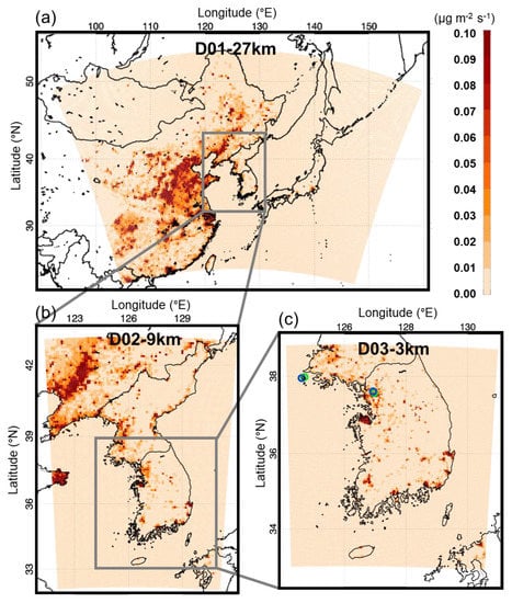 Primary PM2.5 emissions averaged for May 2016 and three nested domains used in WRF-Chem simulations, i.e., (a) D01 (27-km grid spacing for Northeast Asia), (b) D02 (9-km grid spacing for Korean Peninsula), and (c) D03 (3-km grid spacing for South Korea), and the locations of two monitoring sites, i.e., Seoul-Bulgwang (urban) and Baengnyeongdo (background) sites used for 4 chemical components, i.e., SO42−, NO3−, NH4+, and OC in this study. The green and blue circles in D03 domain, respectively, indicate the locations at which the meteorological observation data and aerosol concentration data were measured to verify the model simulations.