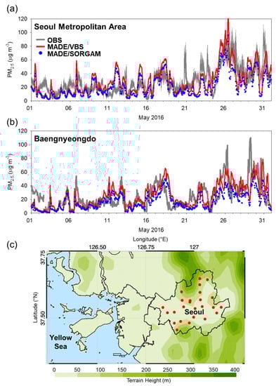 Time series of hourly mean PM2.5 concentrations observed in (a) 25 urban sites located within Seoul metropolitan area (SMA) and (b) Baengnyeongdo (background) site in South Korea. The locations of these 25 sites over SMA are shown in (c). The 25 and 75 percentiles are denoted as grey in SMA. Modeling results in (a,b) from two modules, Modal Aerosol Dynamics model for Europe/Volatility Basis Set (MADE/VBS) and Modal Aerosol Dynamics model for Europe/Secondary Organic Aerosol Model (MADE/SORGAM), were also denoted in red and blue, respectively.
